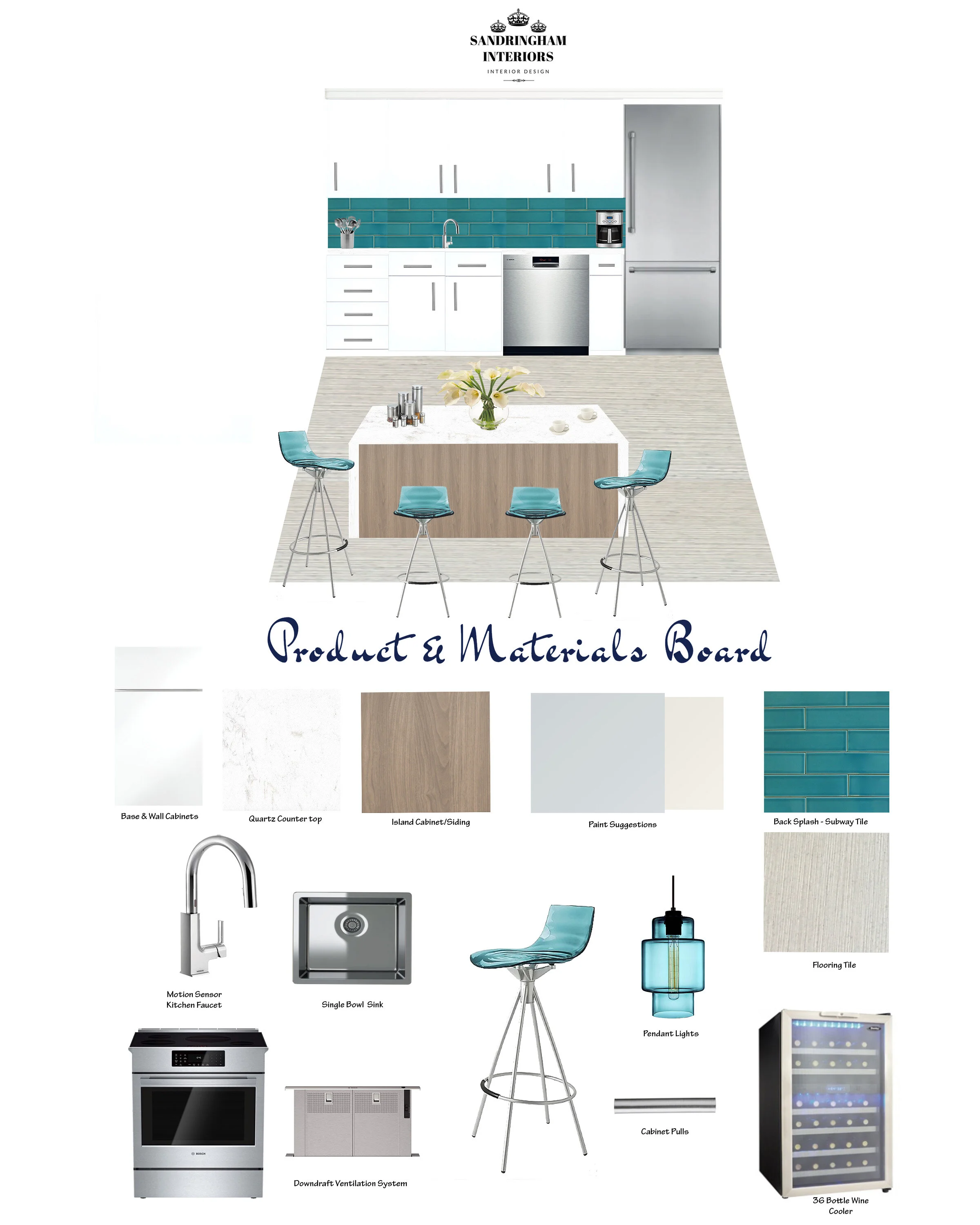 Love the shades of gray in this Kitchen Remodel Materials Board! Having difficulty visualizing your choices? Creating a product and material board can be very beneficial using the E-design process, from here we can create a conceptual 2-D rendering to give you an idea of how everything pieces together.
